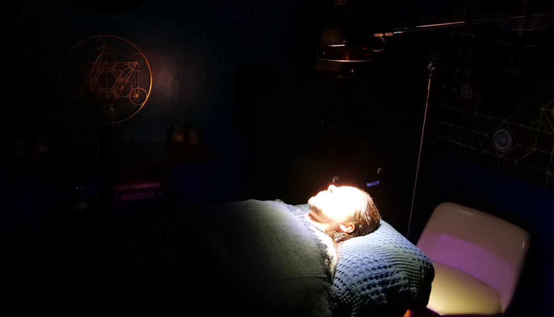 The Resonance Chamber is a guided, multi-sensory therapeutic immersion combining breathwork, vibroacoustic resonance, stroboscopic light patterns, and somatic touch. Visual elements are not intended to replicate or replace chemical psychedelics, but are designed to support closed-eye brainwave entrainment and altered states of awareness.